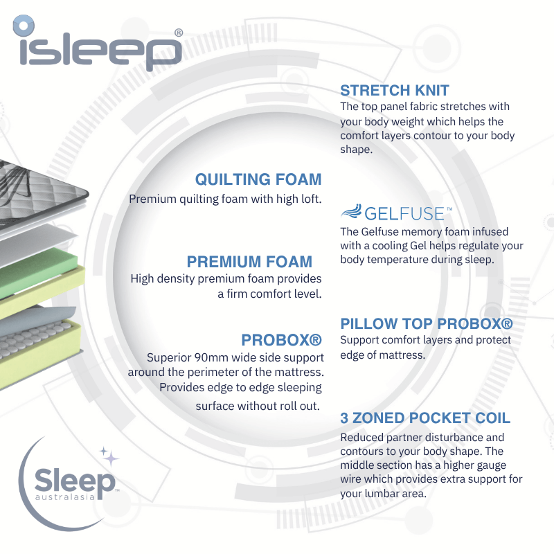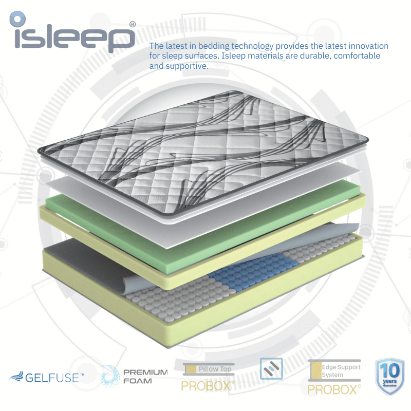 The iSleep Comfort mattress combines innovative sleep technology with premium materials for adaptive, cool and supportive comfort. Featuring Gelfuse™ memory foam for temperature regulation, Probox® edge support for stability, and a 3-zoned pocket coil system for spinal alignment, it delivers balanced pressure relief and long-lasting performance. Perfect for back and side sleepers. Available in Firm or Medium comfort levels.